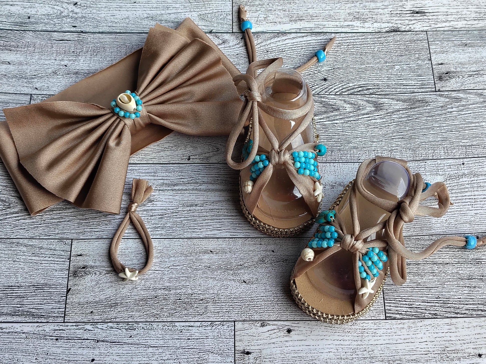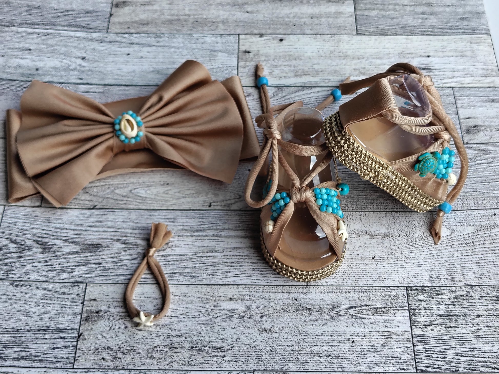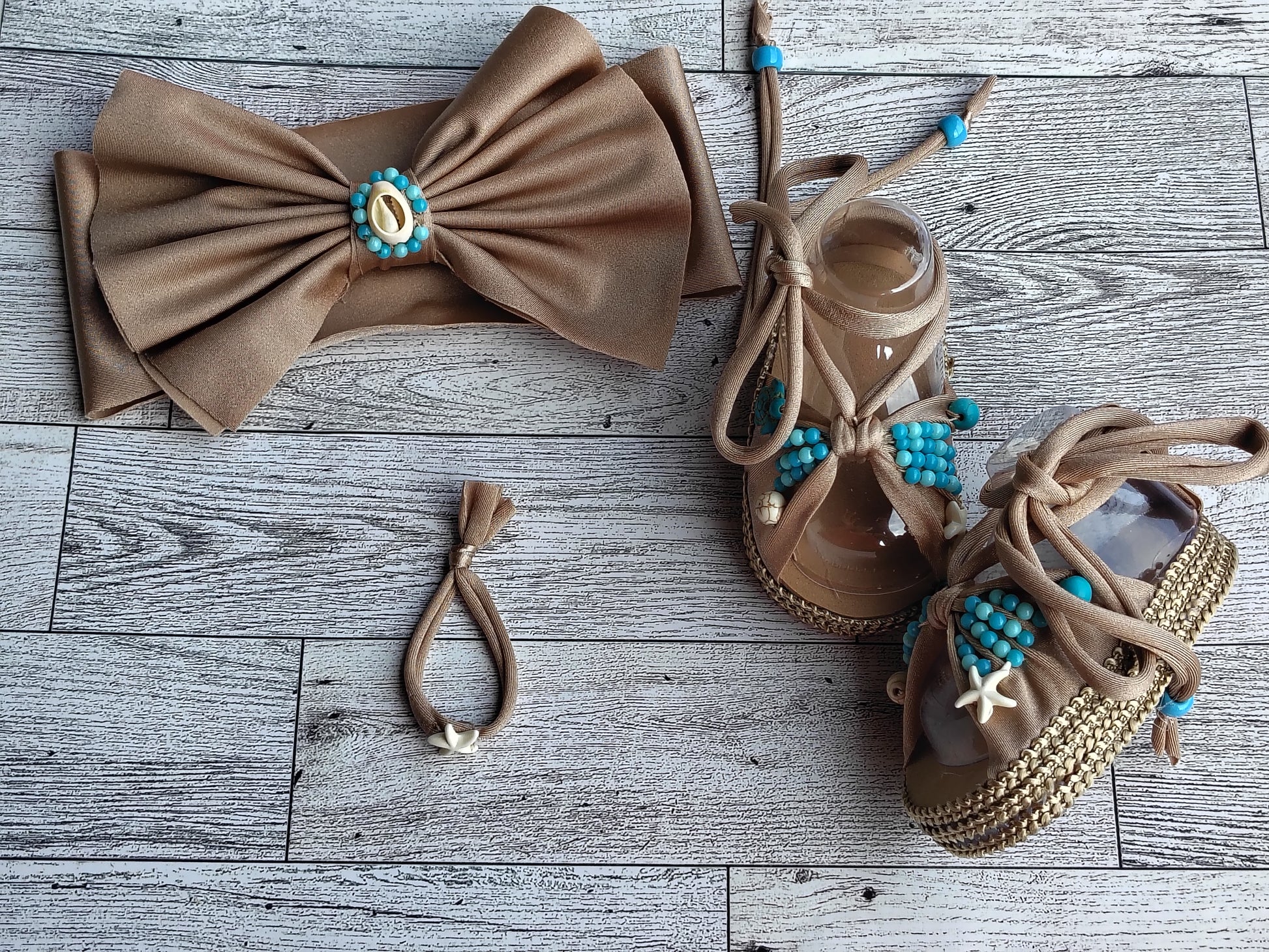 - Coordinating knotted baby sandals made with breathable fabric and non-slip soles.