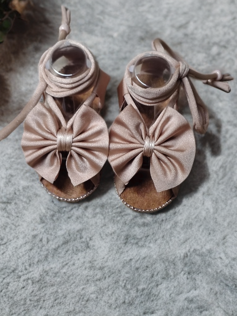 - Coordinating knotted baby sandals made with breathable fabric and non-slip soles.
