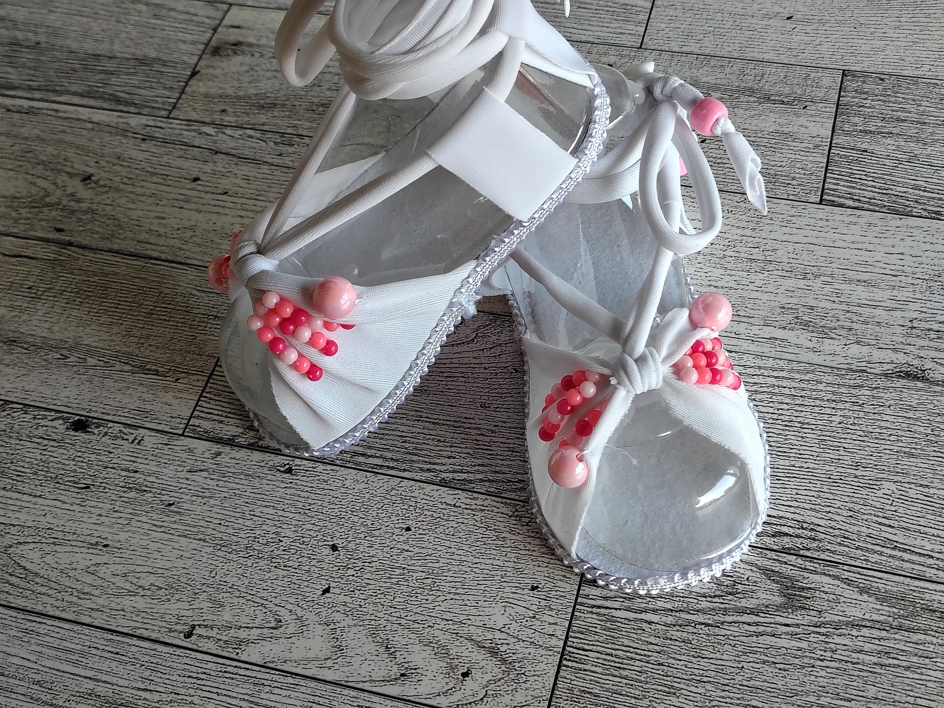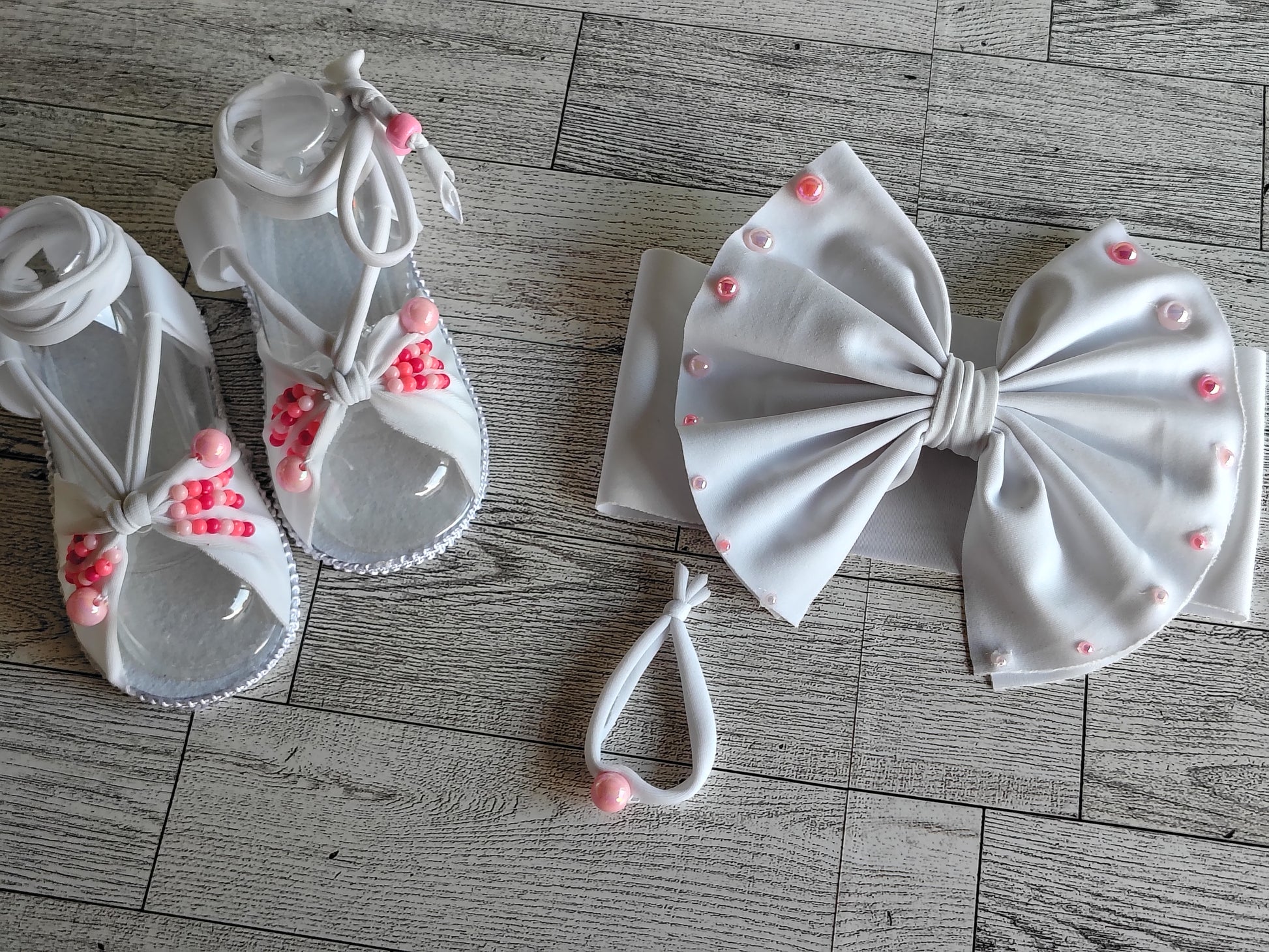 - Coordinating knotted baby sandals made with breathable fabric and non-slip soles.