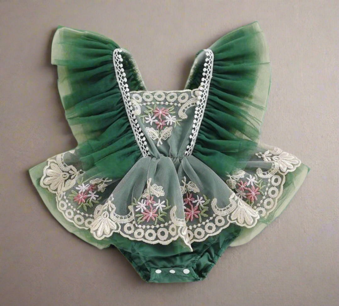This romper dress with mesh and embroidery tutu skirt and our collection of emerald green or diamond Green sandals is the perfect gift for your little princess.