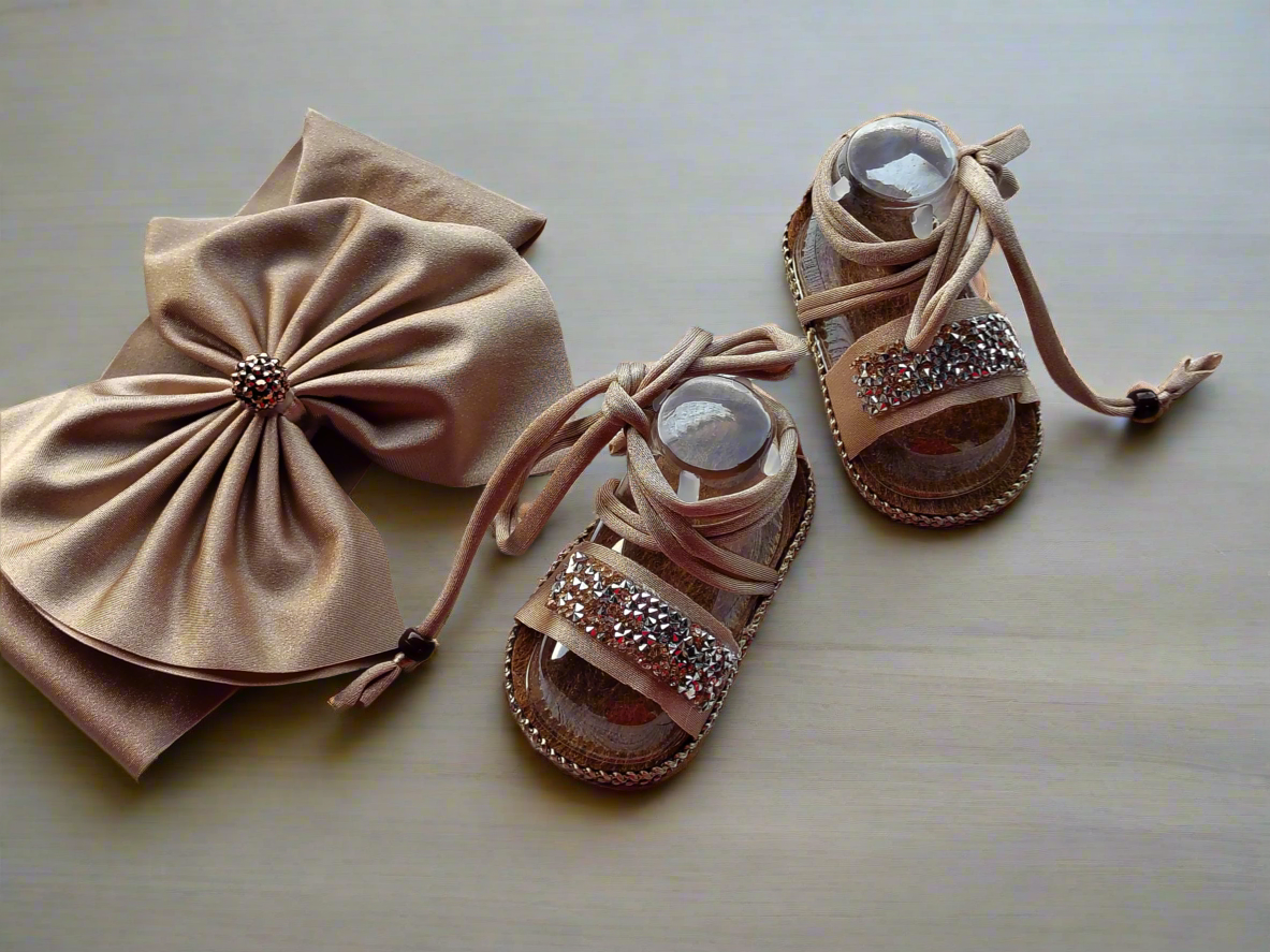 - Coordinating knotted baby sandals made with breathable fabric and non-slip soles.