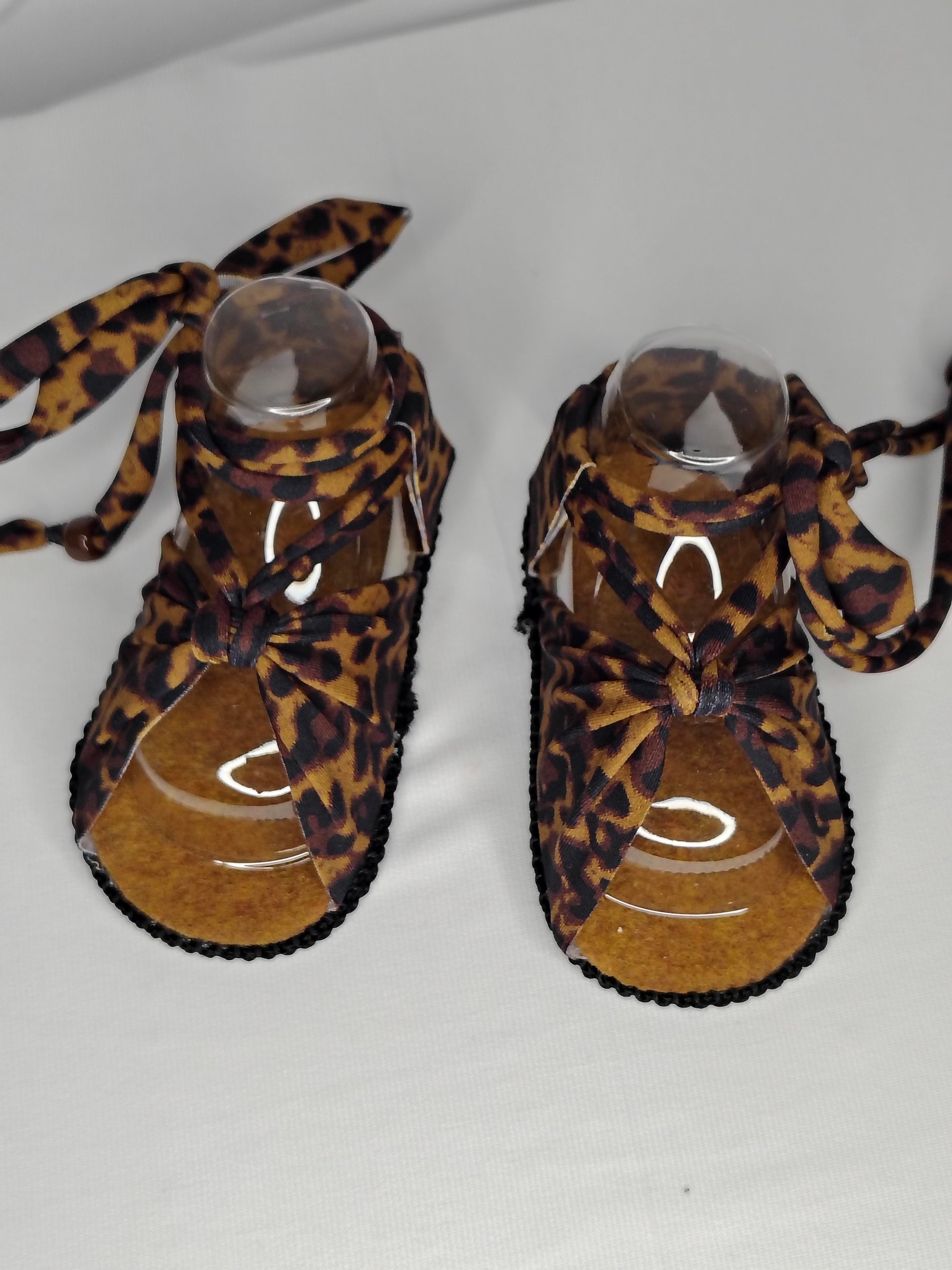- Coordinating knotted baby sandals made with breathable fabric and non-slip soles.