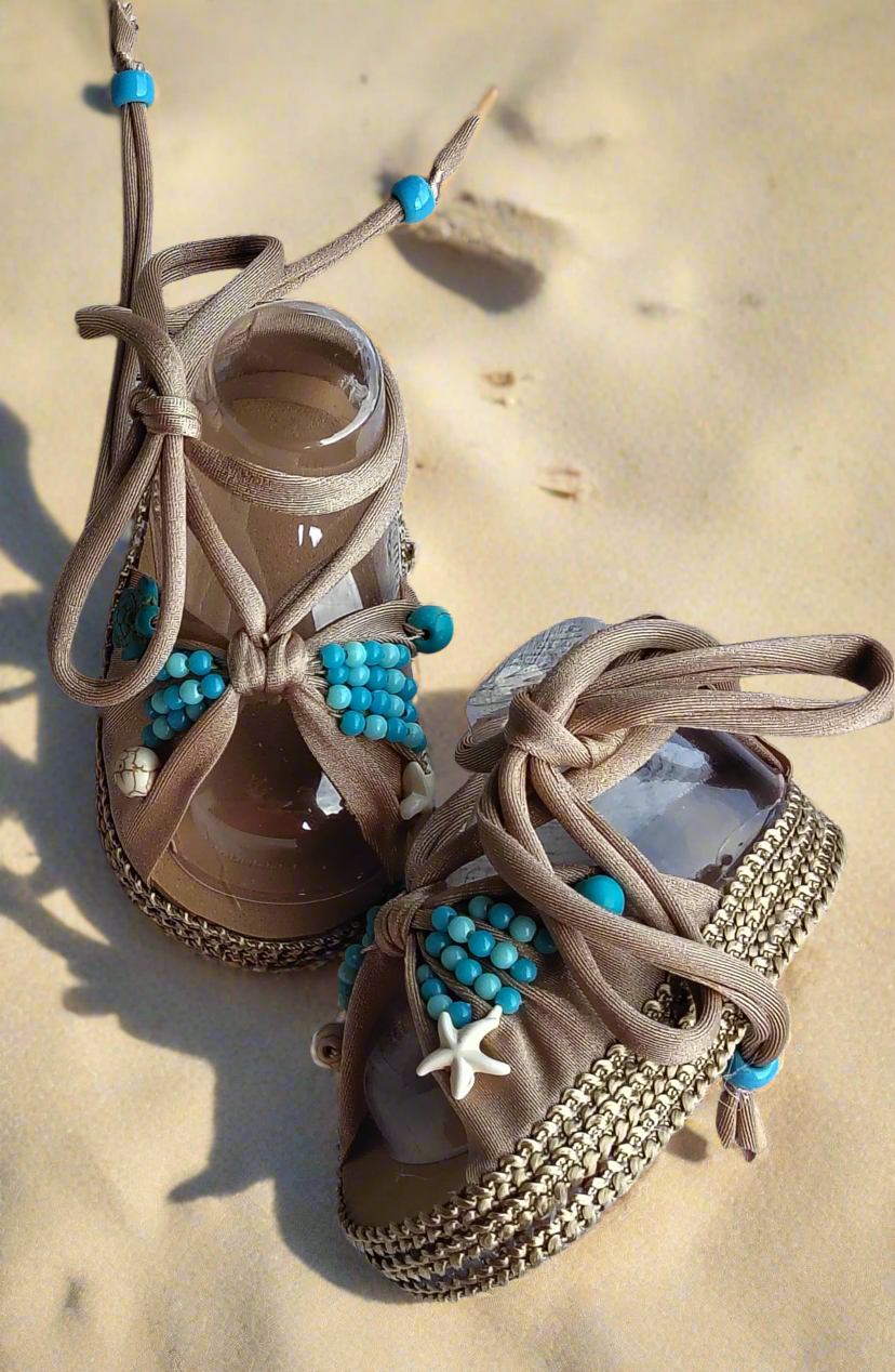 - Coordinating knotted baby sandals made with breathable fabric and non-slip soles.